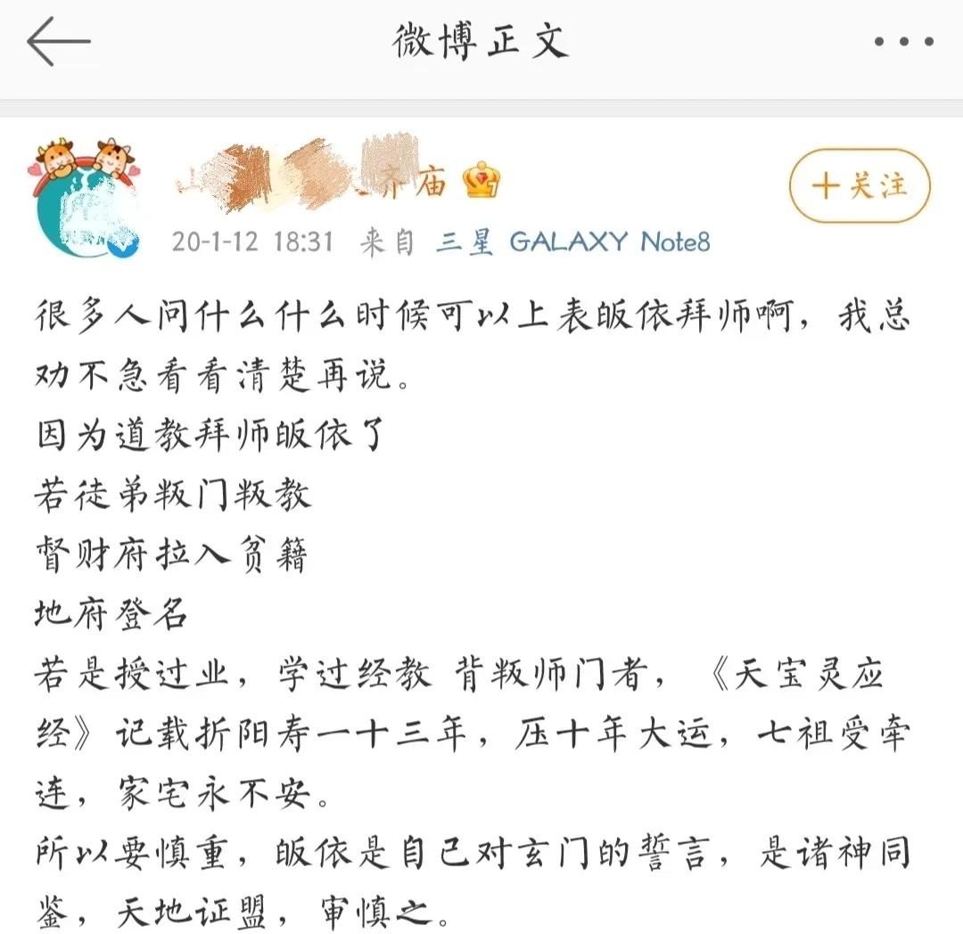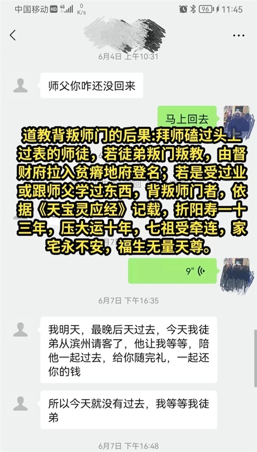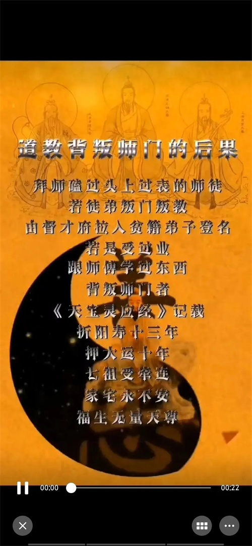 “道教背叛师门的后果:拜师磕过头上过表的师徒,若徒弟叛门叛教,由督财府拉入贫籍,地府登名;若是受过业或跟师父学过东西,背叛师门者,依据《天宝灵应经》记载,折阳寿一十三年,压大运十年,七祖受牵连,家宅永不安,福生无量天尊。”