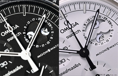 黑色款Mission To The Moonphase的月相盘的桥板采用与盘面一致的颜色,为非透明式设计。黑色款改为半透明材质,透过桥板可隐约看到酣睡的史努比形象。此外,桥板的排布方式由横向改为纵向。