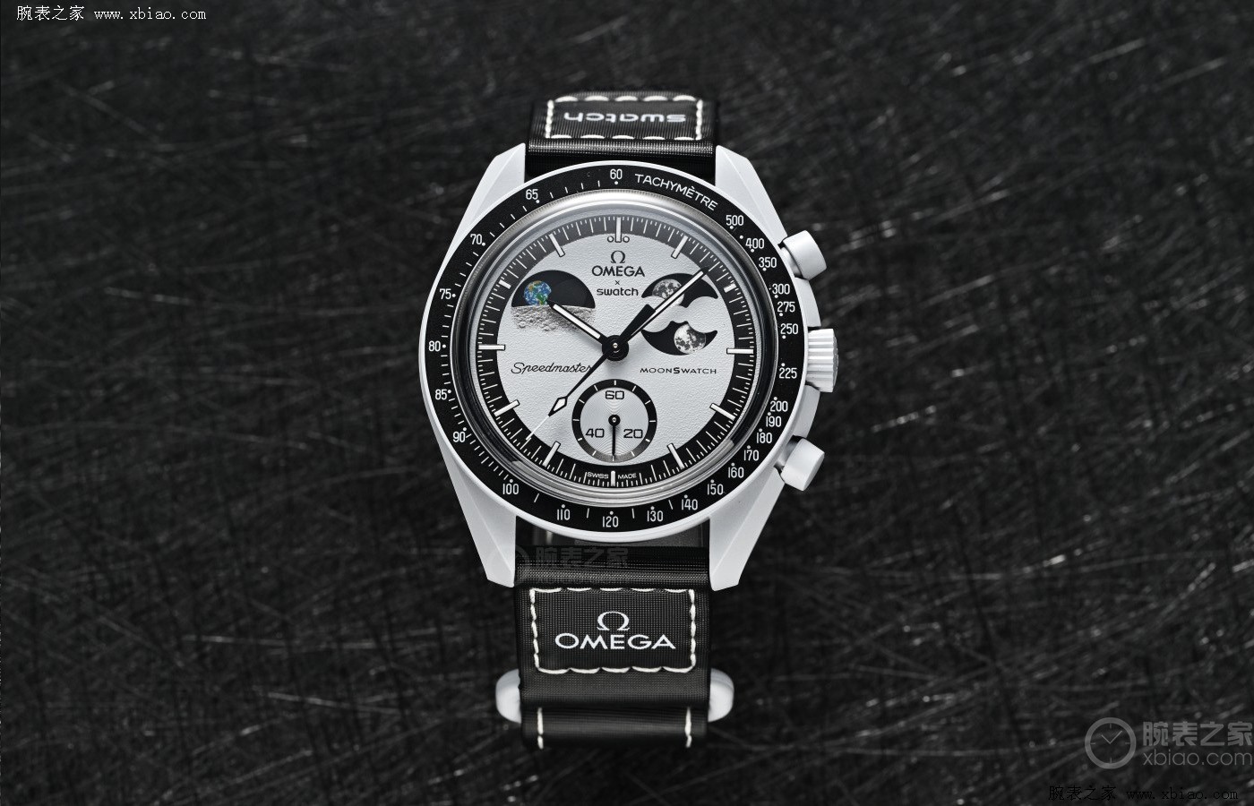[腕表之家钟表文化]近日,备受瞩目的欧米茄斯沃琪联名腕表BIOCERAMIC MOONSWATCH,增添新款“Mission To EarthPhase”。与以往产品简单更换配色的策略不同,该作首创“地相显示”功能,即站在月球的视角观测地球,以此向首款登陆月球的腕表欧米茄超霸致敬。回顾这个诞生自2022年的产品系列,不难发现在短短两年时间内,其内涵与功能得到了极大丰富。今天不妨以时间为序,梳理系列的发展脉络。