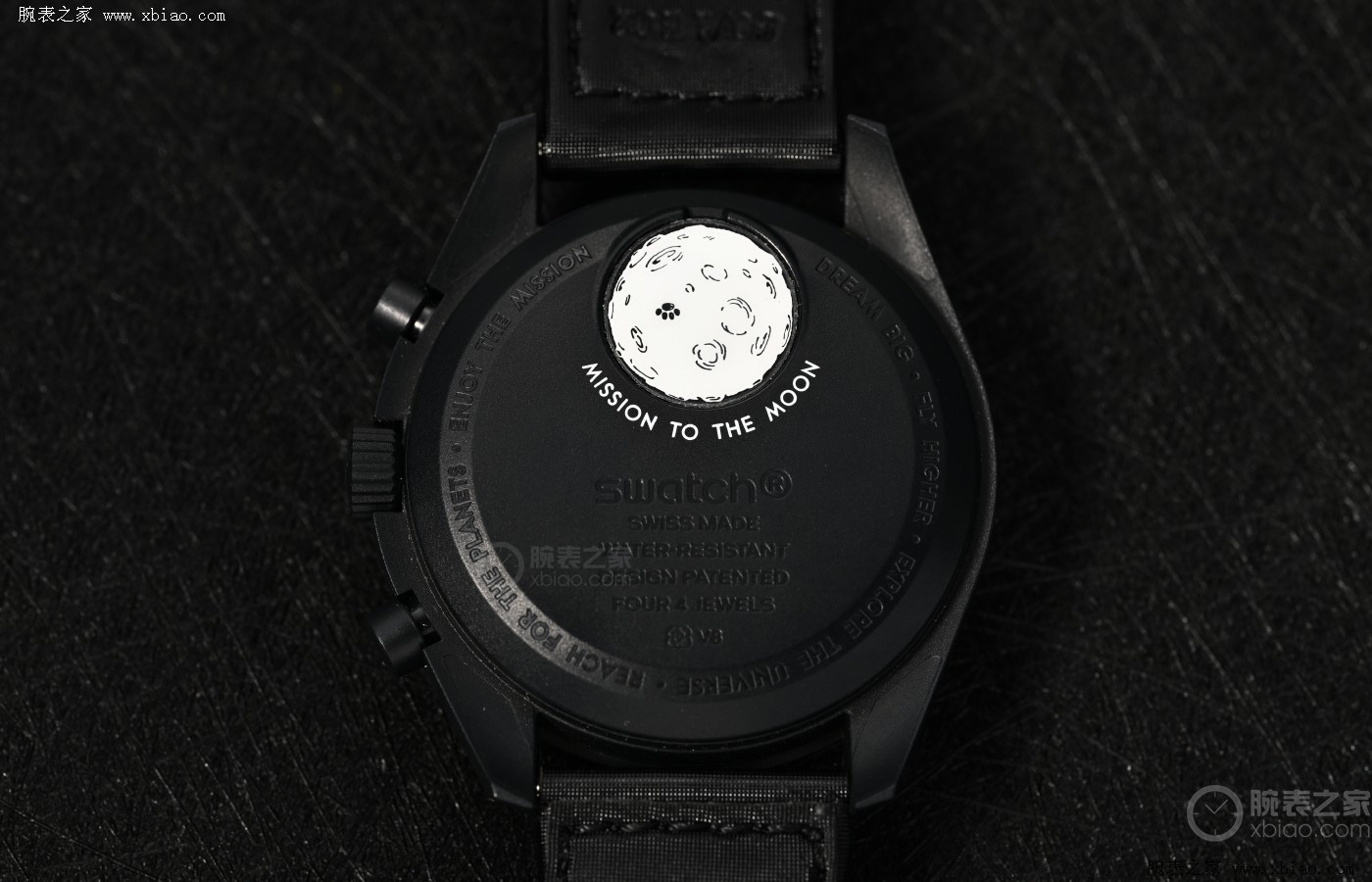 品牌以在月球上观测地球的独特视角,向1969年7月陪同宇航员阿姆斯特朗登陆过月球的腕表——欧米茄超霸致敬。延续Mission to the moon灰黑色外观,本作采用灰色颗粒纹表盘,地相显示盘取代了原60分钟累计计时盘,因此仅可开启一段1分钟以内的计时。翻至背面,月球图案上印制了一枚来自阿姆斯特朗的脚印,呼应主题的同时也丰富了内涵。