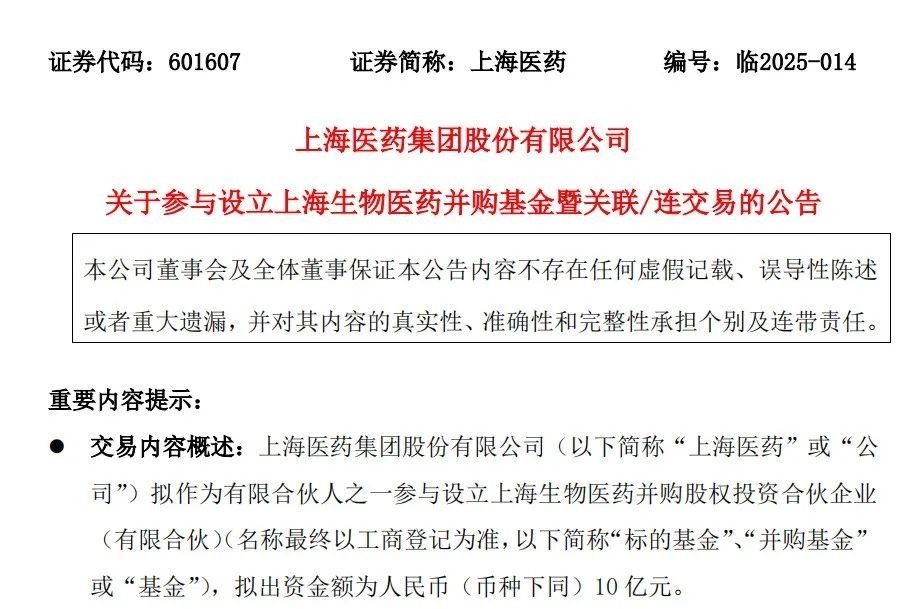 谈及此次参与设立并购基金的目的,上海医药表示,公司作为上海市生物医药行业优质“链主”企业,参与组建设立生物医药并购基金,对上海市生物医药产业及上海医药未来的高质量发展极具战略意义。标的基金将成为促进产业链集聚整合、推动产业转型升级、拓宽资本退出通道的重要工具,可为上海加快打造全球生物医药研发经济和产业化高地提供重要支撑。