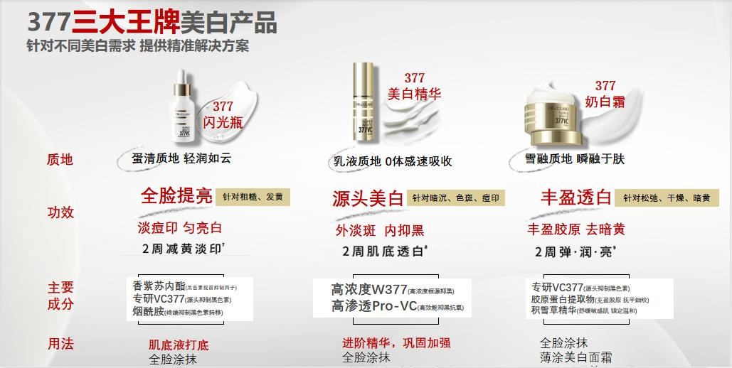 “值得一提的是,针对中国消费者不同美白需求,城野医生旗下还有377闪光瓶和377奶白霜两款377家族产品,分别主打全脸提亮和丰盈透白,为消费者提供精准解决方案,以专业手段,高效解决肌肤问题,用高能表现和消费者一起完美回归精致生活。”郭曦表示。