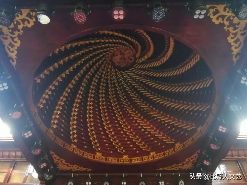 戏台上方榫卯结构的螺旋藻井。