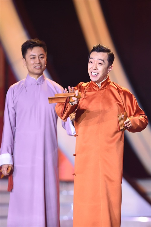 ↑1月20日,田华(左)、雷恪生(中)在大联欢上表演三句半《盛世芬芳》。