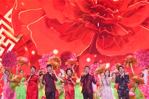 ↑1月20日,张凯丽、江涛、海霞、康辉、喻越越、翟天临(从左到右)在大联欢上演唱歌曲《百花迎春》。
