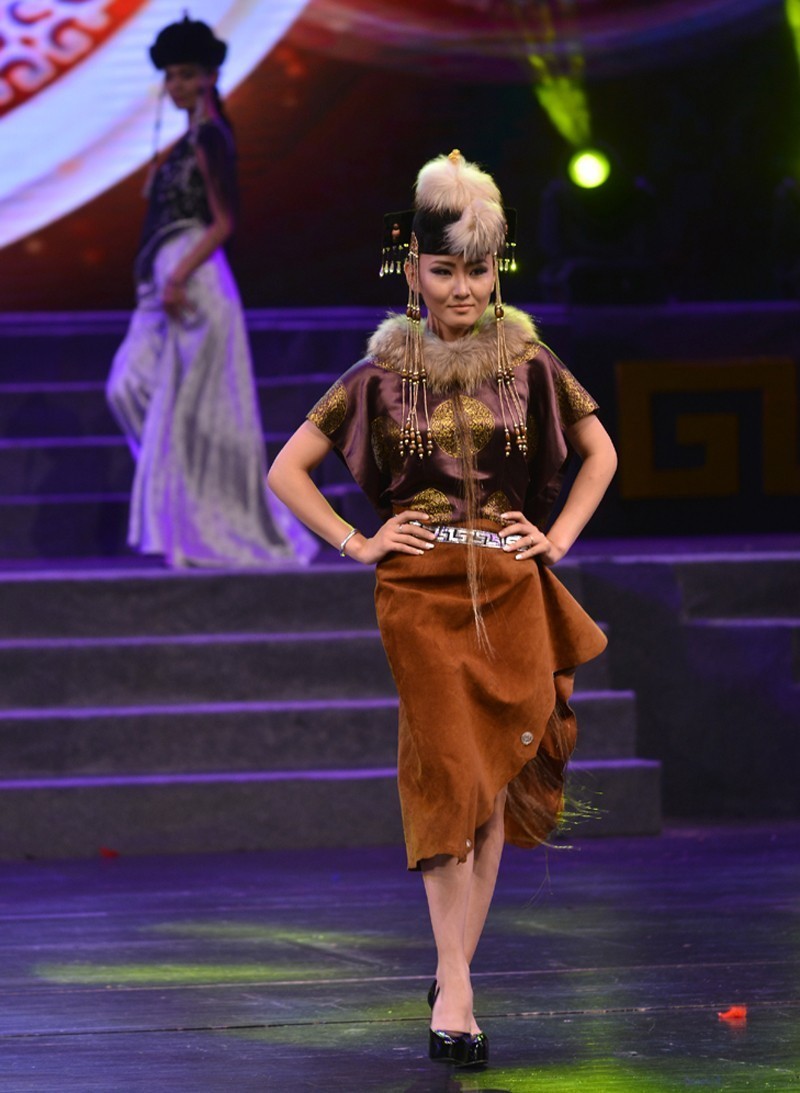 来自蒙古国的模特展示现代蒙古族服装服饰。
