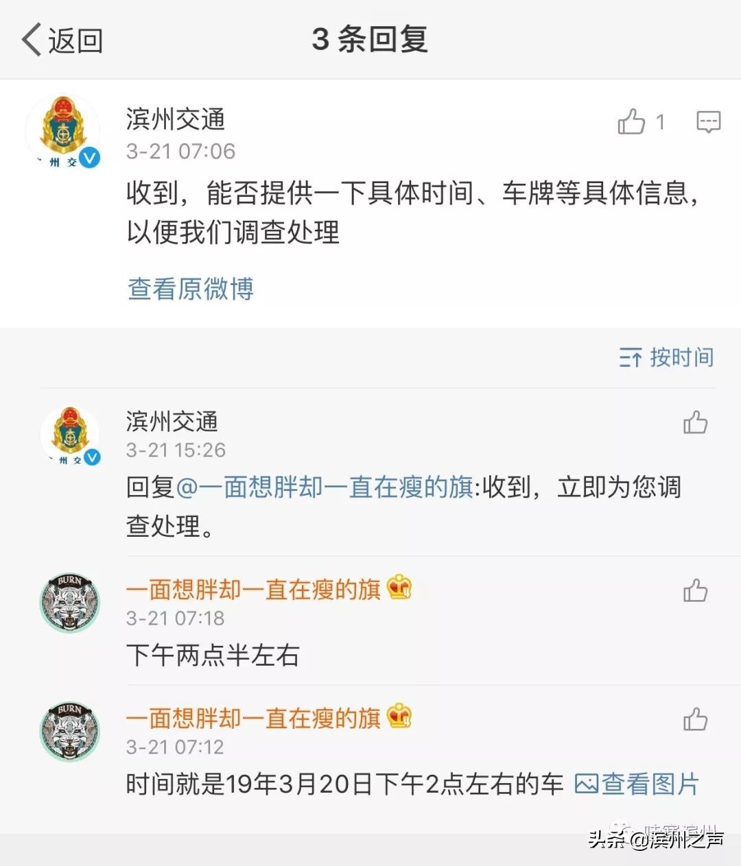 随后,小编看到滨州交通官方微博在询问完网友具体时间和车牌后,表示将立即调查处理。
