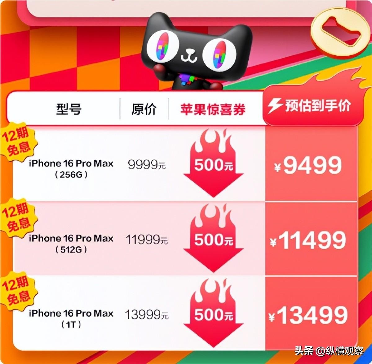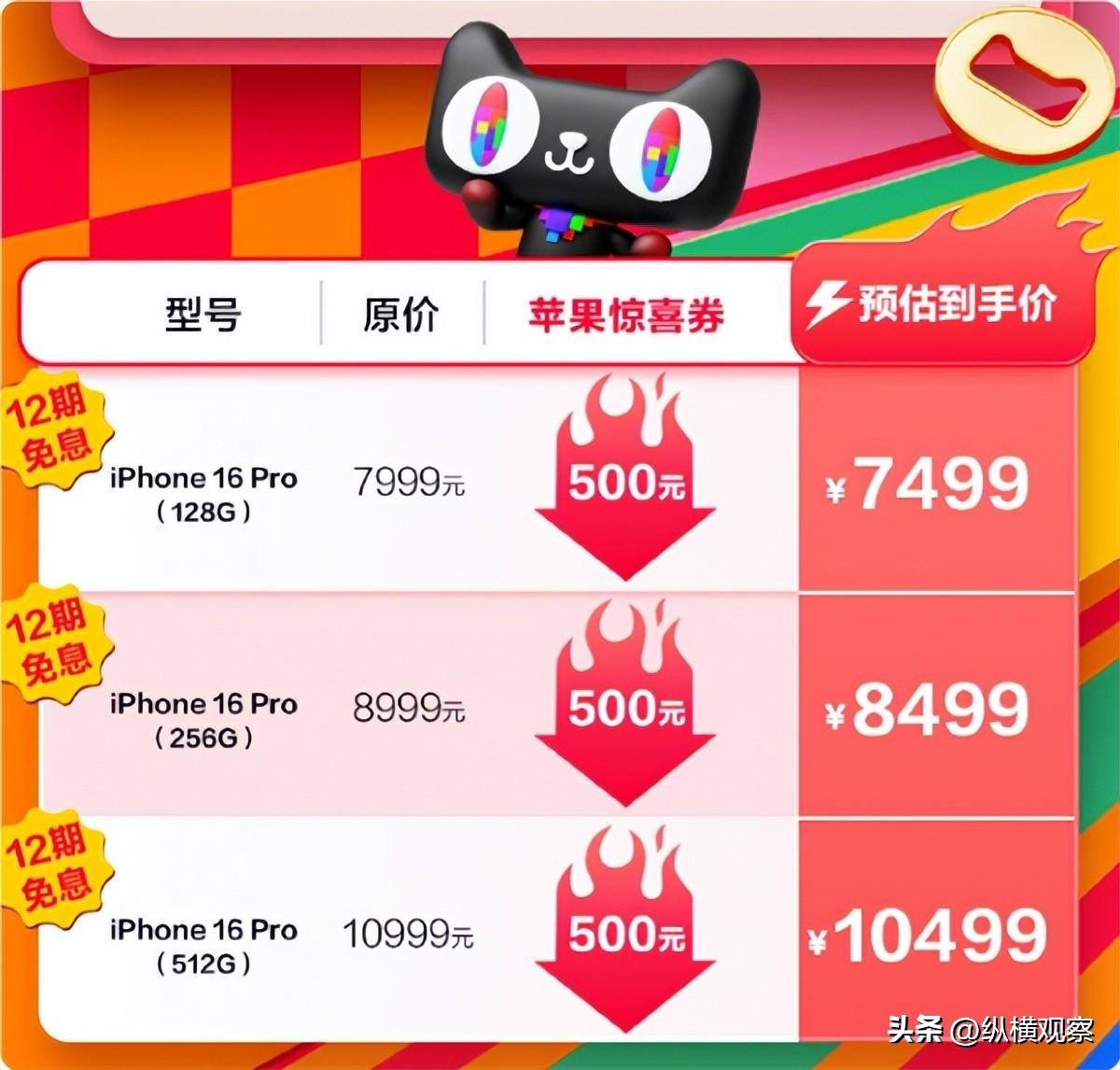 iPhone 16 Pro系列支持12期免息,其中,iPhone 16 Pro使用惊喜券立减500元后,到手价7499元起,iPhone 16 Pro Max到手价9499元起。