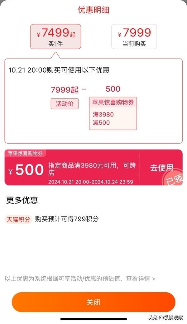 苹果惊喜券使用时间为10月21日20:00-10月24日23:59,可跨店使用。