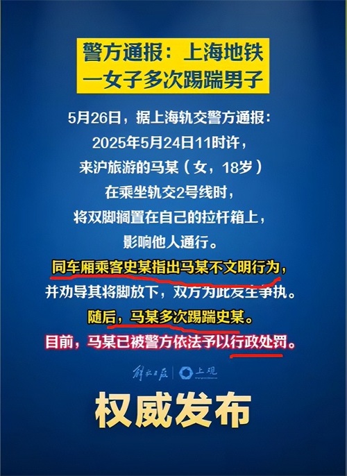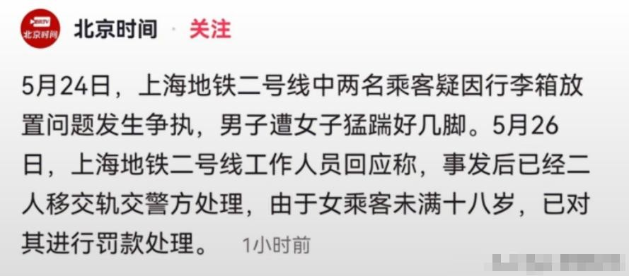 5月26日,上海地铁2号线“女游客踹裆事件”处理结果公布,
