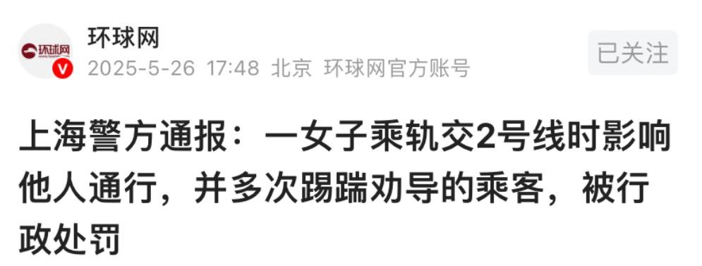 环球网——上海警方通报:一女子乘轨交2号线时影响他人通行,并多次踢踹劝导的乘客,被行政处罚