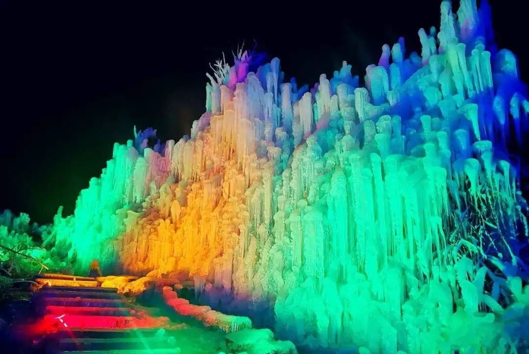 冬日里的七彩大峡谷美成了仙境,宛如一片片冰域森林!晶莹剔透的冰挂,造型各异、美轮美奂,让人赏心悦目,叹为观止。夜幕降临,红色的树挂好似龙宫的珊瑚,色彩斑斓的冰瀑又好似瑶池仙境,如梦如幻,如诗如歌,仿佛闯进了一个流光溢彩的神秘仙境。