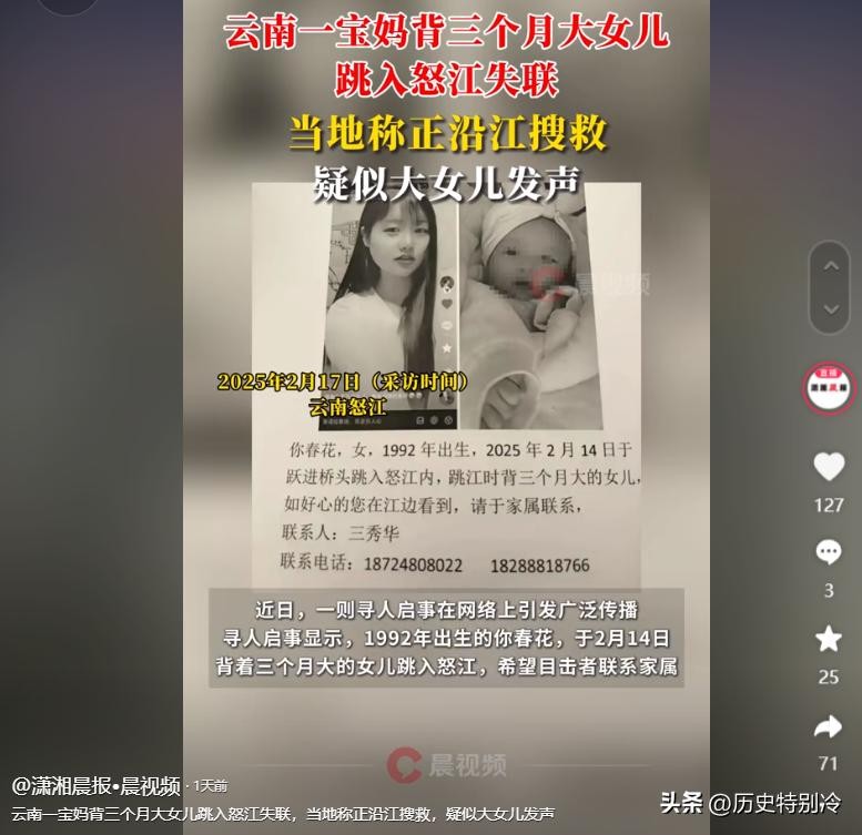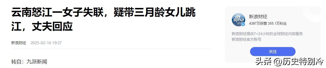 新浪财经:2025-02-16,《云南怒江一女子失联,疑带三月龄女儿跳江,丈夫回应》