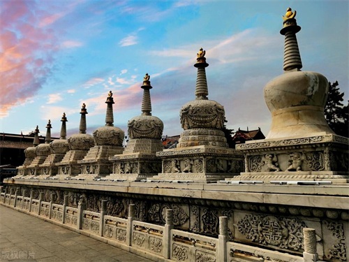 呼市标志景点五塔寺,是一座藏传佛教寺院,巍然屹立的宝塔,既有汉族宫殿的特色,也有少数民族和藏传风范融合其中,五座方形舍利塔为砖石结构的喇嘛教塔,塔身玲珑秀丽,古迹石刻精美。