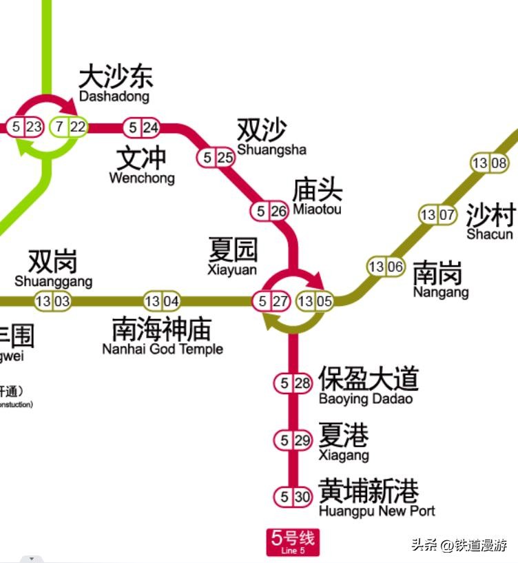 地铁方面,广州市内新增了5号线东延段和7号线二期,其中,5号线东延段由原来的文冲站延长到了黄埔新港,同时在夏园和13号线换乘。五号线东延段全长9.8公里,从既有五号线文冲站向东延伸,共设双沙、庙头、夏园、保盈大道、夏港、黄埔新港等6座车站,与东莞市仅一江之隔的黄埔新港站还预留了继续向东延伸与东莞地铁换乘的条件。预计十二月底通车运营。