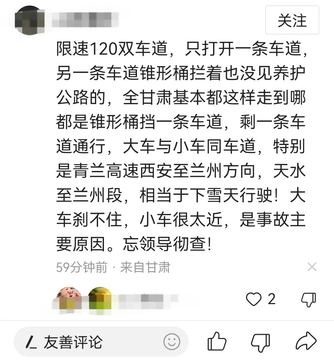 据当地朋友爆料,这个路段车祸频发。全甘肃路段虽然是双车道,但基本上都是只开放一条车道。另一条车道常年被锥形桶拦着。