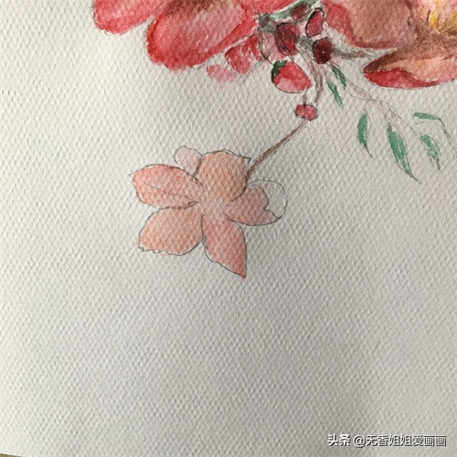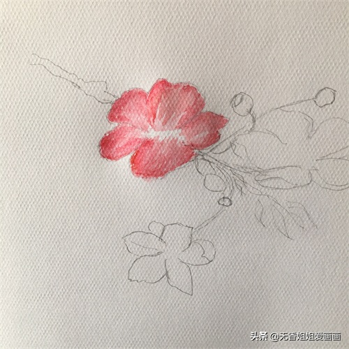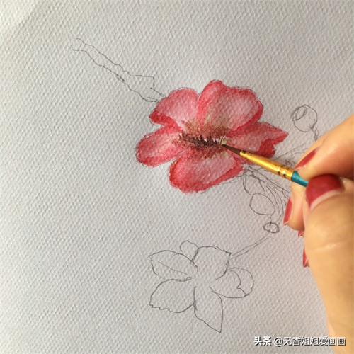 2、用毛刷蘸水湿润花瓣,用浅红色加少量的水调和均匀后,涂抹花瓣,花瓣的边缘部分颜色深一些。