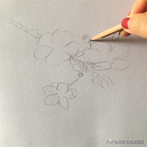 1、用铅笔在画纸上勾勒出桃花的大致轮廓,注意花瓣的方向、大小以及位置。画出花苞、叶片