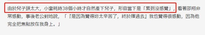 据台媒报道,由于宝宝头太大,小蛮耗费了38个小时才自然诞下儿子,整个人几乎累到失去知觉。