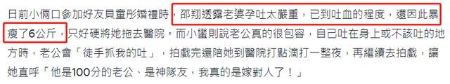 只是,怀孕后的她也过得十分不容易,老公邵翔曾透露:老婆孕吐十分严重,已经到了吐血的程度,还因此暴瘦6公斤。