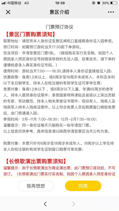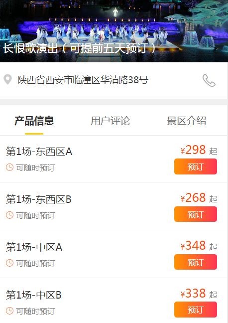 温馨提示:由于长恨歌演出为商业演出票,此门票预订成功后,不可退订。(长恨歌演出门票实行实名制,如因个人原因录入预定身份证号码错误导致的无法入园,后果自负,请下单时谨慎检查录入真实身份证号码。)