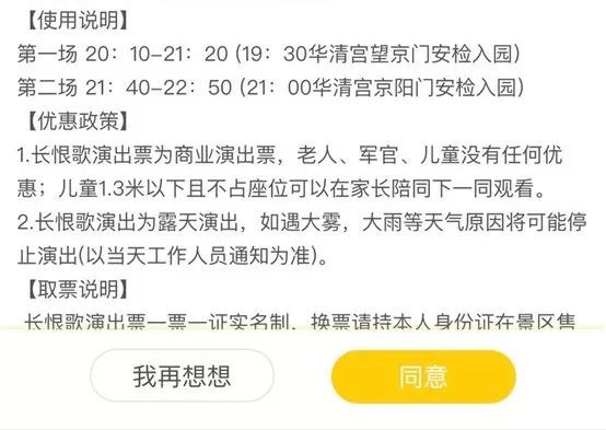 2.长恨歌演出为露天演出,如遇大雾,大雨等天气原因将可能停止演出(以当天工作人员通知为准)。
