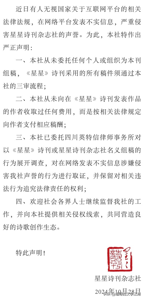 ⑤稿件风格、质量标准,建议购进少量《星星·诗歌原创》样本进行对照。