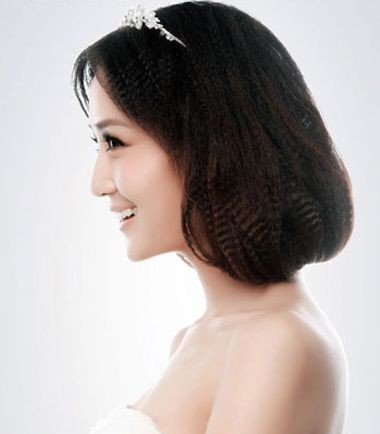 玉米须烫发发型的一个变式设计,梳两边的玉米须烫发发型,发质会自然而然的蓬松起来,玉米须烫发发型从发尾开始向内卷起来,做成蓬松的烫发盘发发型,玉米须烫发盘发更有韵味一些。