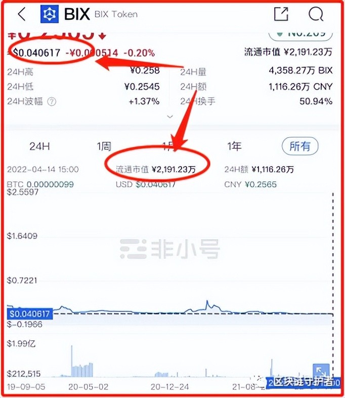 2022年的4月14日,BIX价格2毛5分钱,总体流通市值2200万不到。