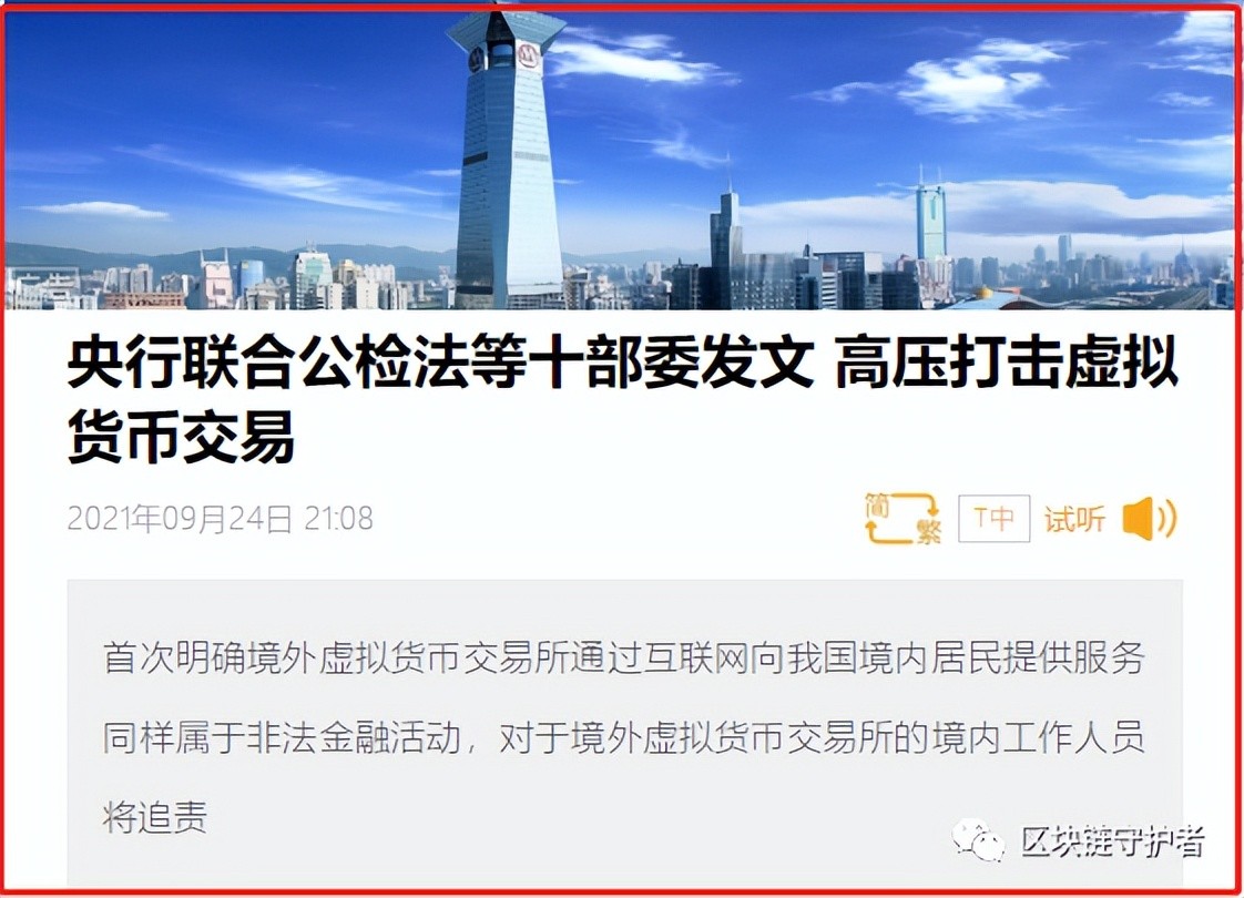 2021年的9月24日,央行、公安部等十部委联合发声!重拳整治虚拟货币非法交易,其中明确禁止国内交易所,禁止为国内用户提供交易。
