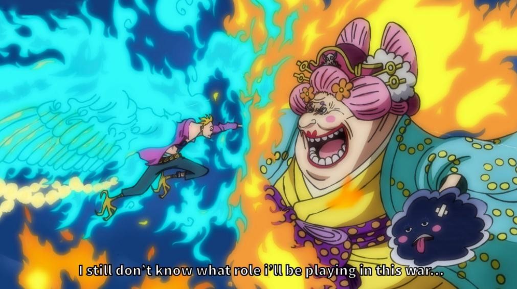 前面的都是不过马尔科比较短暂的施展身手。而在和之国篇中,马尔科再次出现帮助路飞一行人,并且此次他面对的是四皇之一的大妈。为了帮助路飞达到目的,马尔科只身一人与大妈纠缠,施展浑身解数拖出了大妈,与大妈打得有来有回。虽然一度被大妈掐住脖子,但是马尔科整体来说也是能够应付得来!