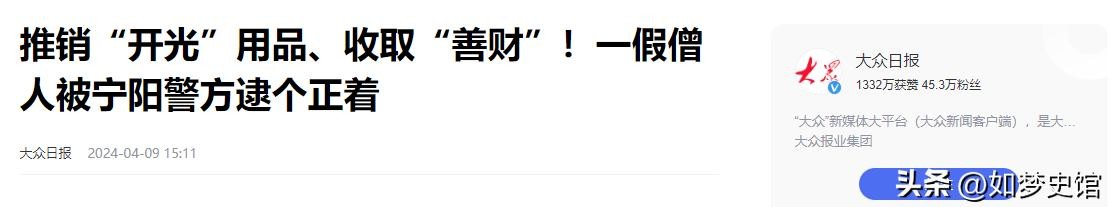 信息源:推销“开光”用品、收取“善财”!一假僧人被宁阳警方逮个正着,大众日报2024-04-09。