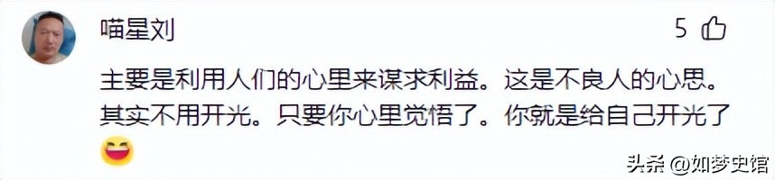 “主要是利用人们的心里来谋求利益。这是不良人的心思。其实不用开光。只要你心里觉悟了。你就是给自己开光了。”