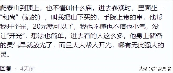 “爬泰山到顶上,也不懂叫什么庙,进去参观时,里面坐一‘和尚’(猜的),叫我把山下买的,手腕上带的串,他帮我开个光,20元就可以了,我也不懂也不信也小气,没让‘开光’,想法也简单,进去看的人这么多,他身上储备的灵气早就放光了,而且大大帮人开光,哪有无此强大的灵。”