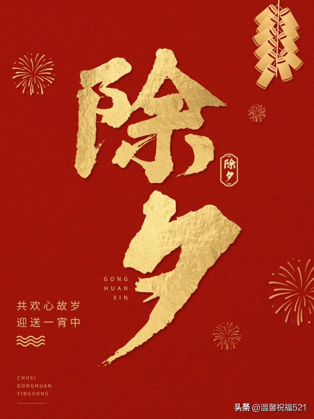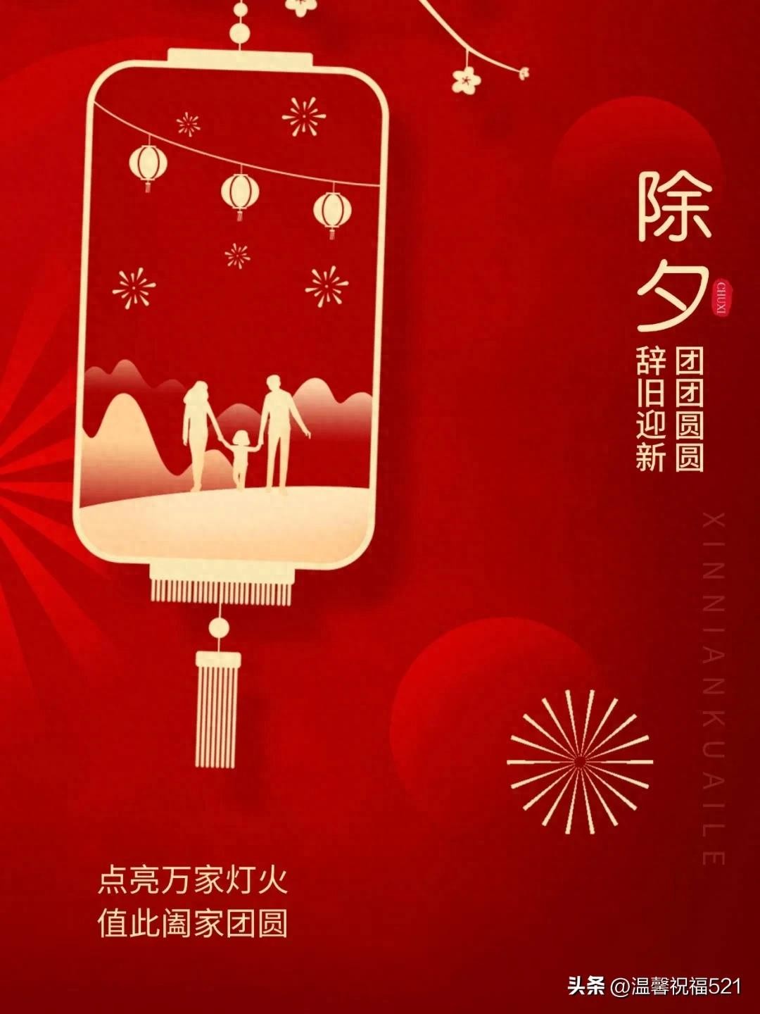 旧年去,新年来,除夕夜里乐开怀。愿你在新的一年,遇到的都是温暖,收获的都是惊喜。走过的每一步都坚实有力,实现所有的小目标,开启人生新精彩。