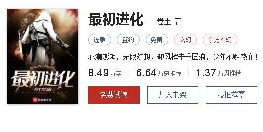 3、书名:《最初进化》,作者:卷土,8.4万字,刚刚写,已经两万收藏了