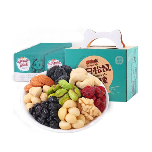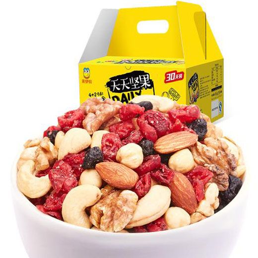 三只松鼠的每日坚果,每包里面有巴旦木仁、榛子仁、核桃仁、腰果仁、蔓越莓干、蓝莓干、提子干、黑加仑葡萄干共8款热销坚果及果仁,多个品种,好吃不腻,而且不添加色素、香精,营养全面,非常受欢迎。