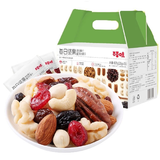 百草味的每日坚果甄选来自美国的巴旦木、越南的腰果仁、新疆的核桃、北美的蔓越莓干、土耳其的榛子仁、乌兹别克的黑加仑、汤姆森的葡萄干、樱桃脯组合装,营养搭配,新鲜美味,一如既往的好吃。