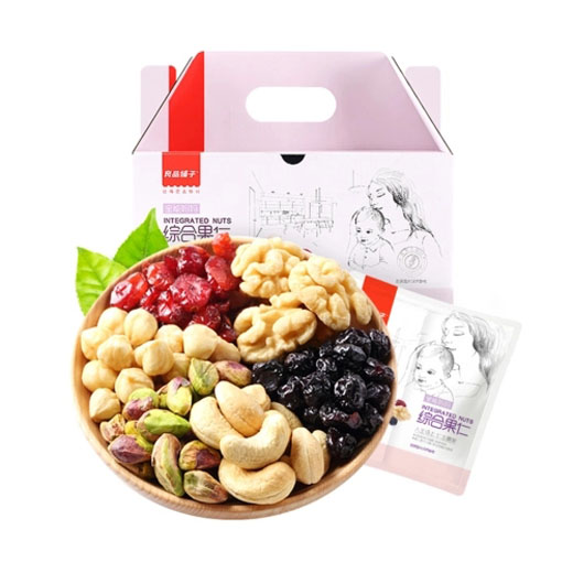良品铺子的每日坚果基本都是原产地直采,材料选自5国,新疆的核桃仁、智利的蓝莓干、有土耳其的榛子仁、美国进口的蔓越莓干和开心果仁、越南的WW320型腰果,经小火慢慢的烘烤而成,不上火、不添加色素、香精及其他食品添加剂,采用干湿分离包装,分区锁鲜,果仁干脆,果脯新鲜,每日一袋营养健康搭配。