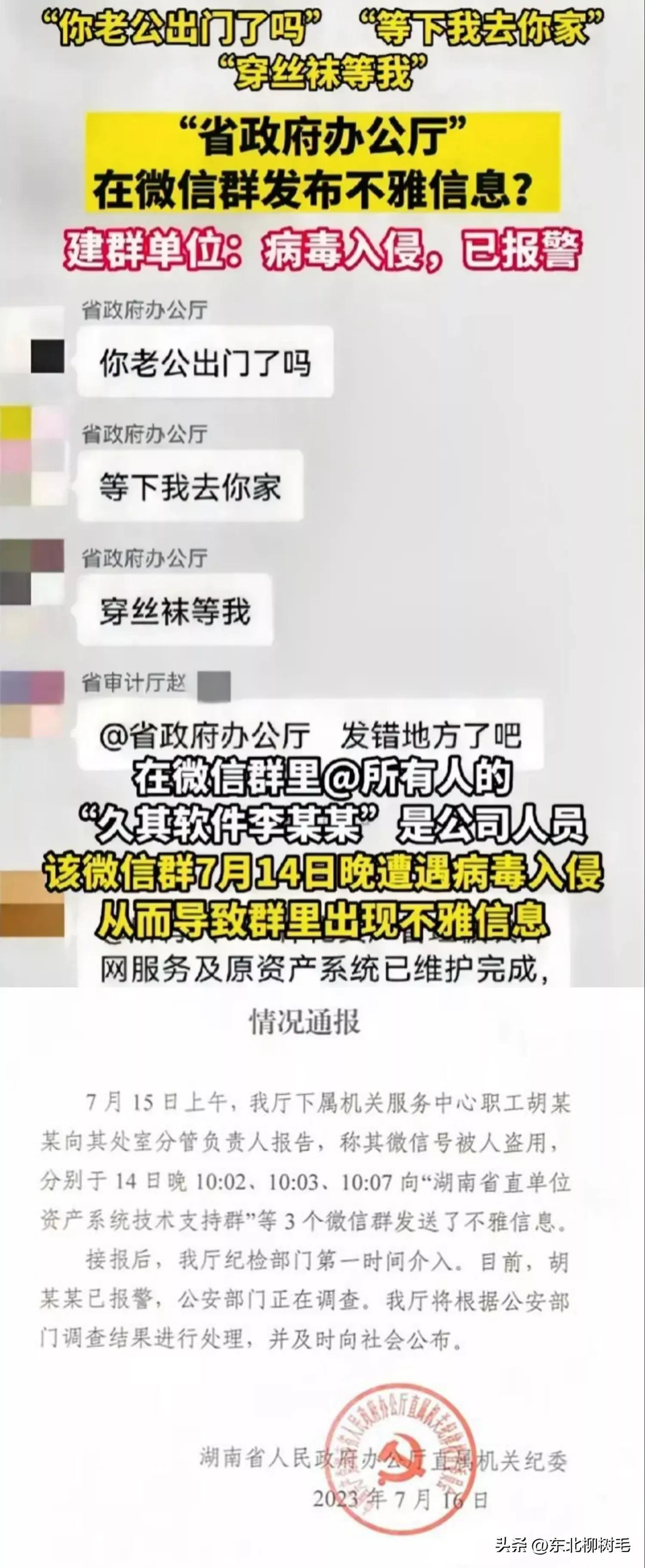 【湖南回应涉“省直单位”微信群不雅信息事件:纪检部门第一时间介入 警方正在调查】7月15日上午,湖南省人民政府办公厅下属机关服务中心职工胡某某向其处室分管负责人报告,称其微信号被人盗用,分别于14日晚10:02、10:03、10:07向“湖南省直单位资产系统技术支持群”等3个微信群发送了不雅信息。之前曾回应“病毒入侵”,7月16日,湖南省人民政府办公厅直属机关纪委就“湖南省直单位资产系统技术支持群”不雅信息一事通过红网作出回应。接报后,该厅纪检部门第一时间介入。目前,胡某某已报警,公安部门正在调查。该厅将根据公安部门调查结果进行处理,并及时向社会公布。
