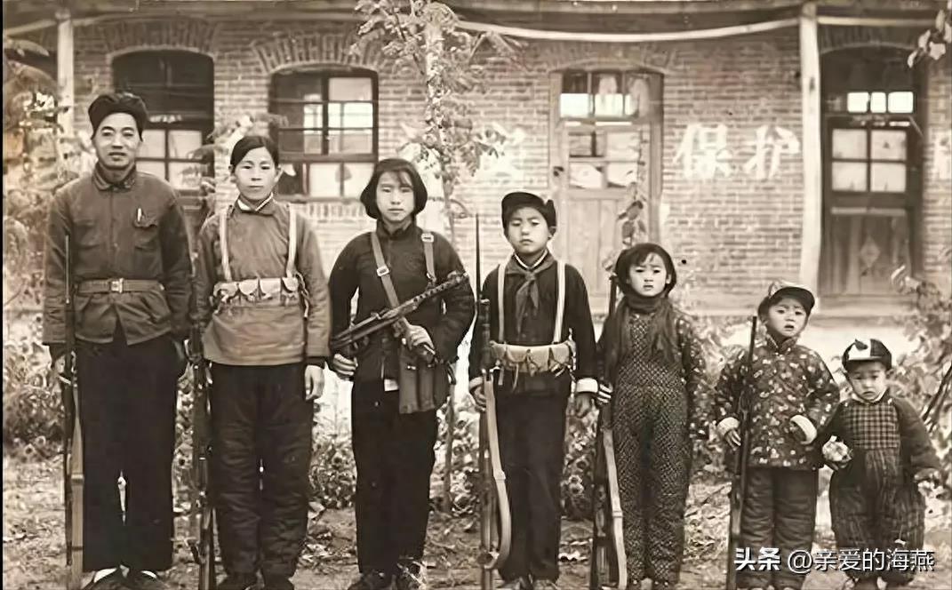红色年代,“全民皆兵”的真实写照!全民皆兵赞雄风:七人英姿六杆枪,一个尚幼稳站桩。第4个小孩子的枪是马枪,当有一般民兵,基干民兵,武装民兵,武装民兵是发枪,我当时发的是马枪,比三八式短些。那个年代确实是这样,就我们村庄基本家家有四个孩子,象我家姊妹六个也不少,最多的一家姊妹十个(九女一男)现在很难看到那么多的姐妹,