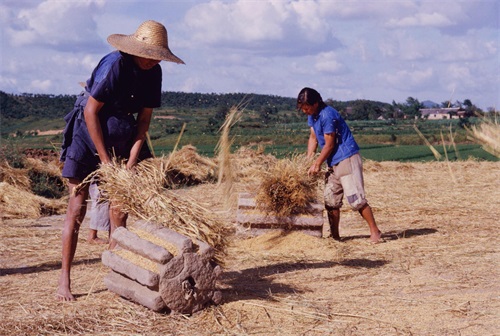 “两位女社员正在石磙中揉摔着麦秸,金黄的谷子掉落在凹槽里,”是麦子还是谷子?