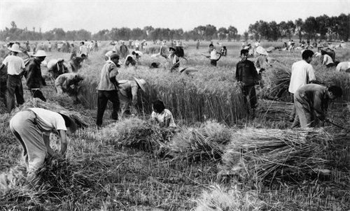 外国摄影家sovfot拍摄,某学校师生一起协助社员们一起收割小麦。