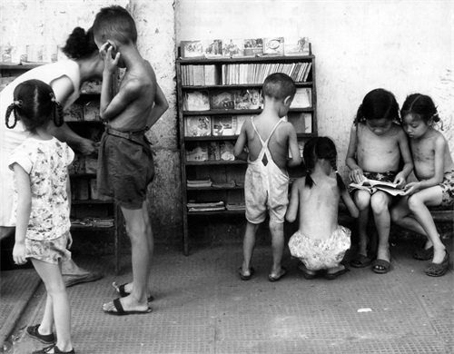 一群孩子在路边的小人书摊,女孩光膀子不是缺衣缺家教,我小时候我们村小女孩(一二年级以下)在家经常光膀子,大家见怪不怪,我们男孩女孩在一起爬树捉迷藏,好像没什么,就是下池塘游泳,都是脱衣服下水,裤衩都脱了,就是大一点的女生才开始不脱衣服。