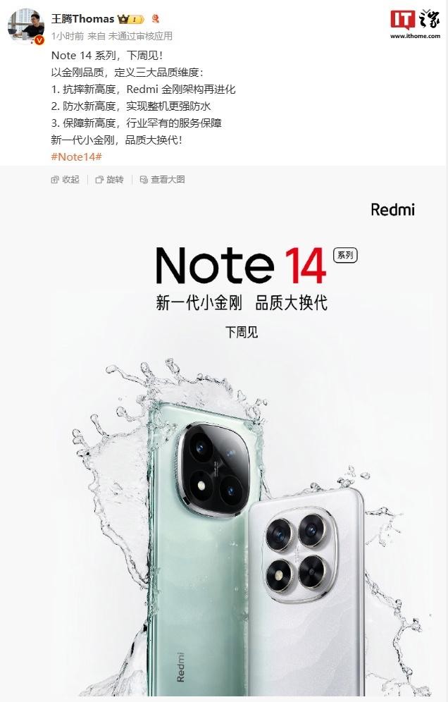 据早些时候报道,王腾已经宣布 Redmi Note 14 系列手机“下周见”,并公布了外观海报公布。抗摔、防水、服务保障将成为新机的三大亮点,海报还展示两种镜头设计,后置镜头及闪光灯呈对称排列,机身背面较为圆润。