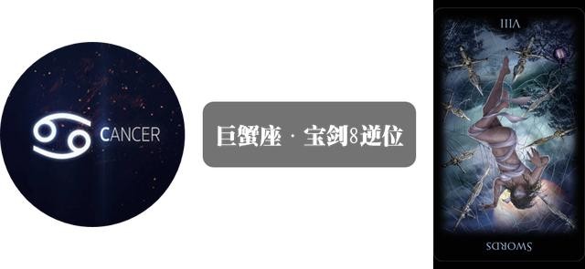 巨蟹座7月份的运势对应的是宝剑8逆位。女人被困在蛛网中,挣扎不得,周围八把剑直指她,可以说处于非常不利的局势下。但是所幸是张逆位,所以,还是有挣脱的机会的。