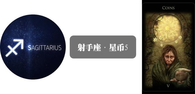 射手座的7月运势对应的是星币5。画面上一个乞丐在伸手乞讨,背后的教堂玻璃窗打下暖黄色的光芒。这张牌显示了一种困境,但是你要相信,生命本身是支持你的(背后暖光色的光的护佑)。