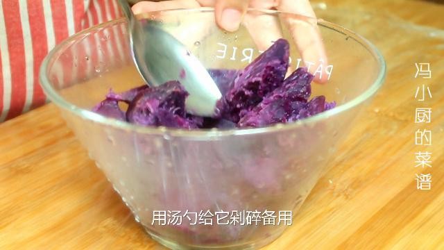 将蒸好的紫薯用汤匙压碎,锤成紫薯泥,