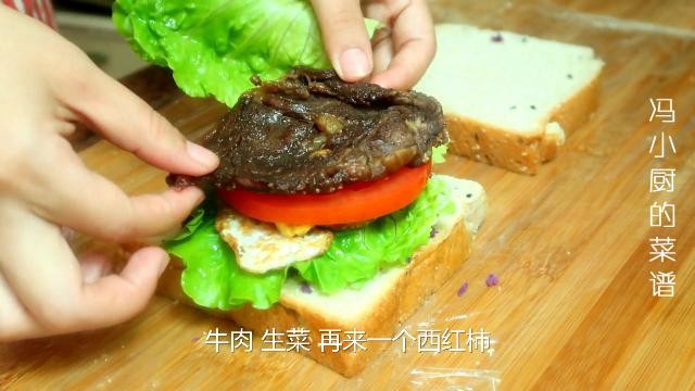 分别铺上生菜,鸡蛋,西红柿,牛排,最后再铺个生菜,是不是很漂亮