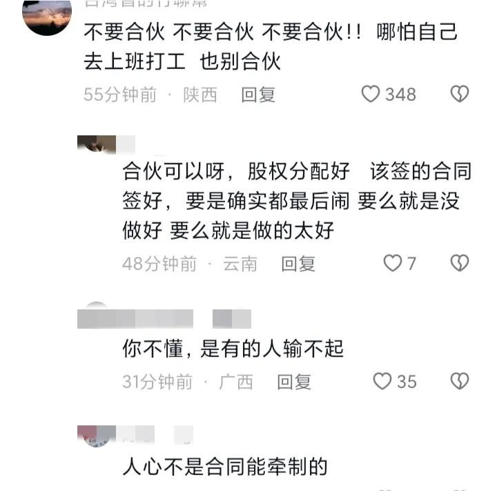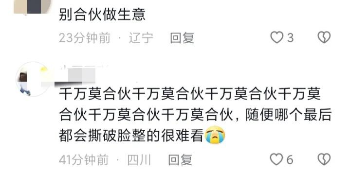 有些网友则表示,做生意千万不要和人合伙,无论开始有多好,最后都会因为利益撕破脸。